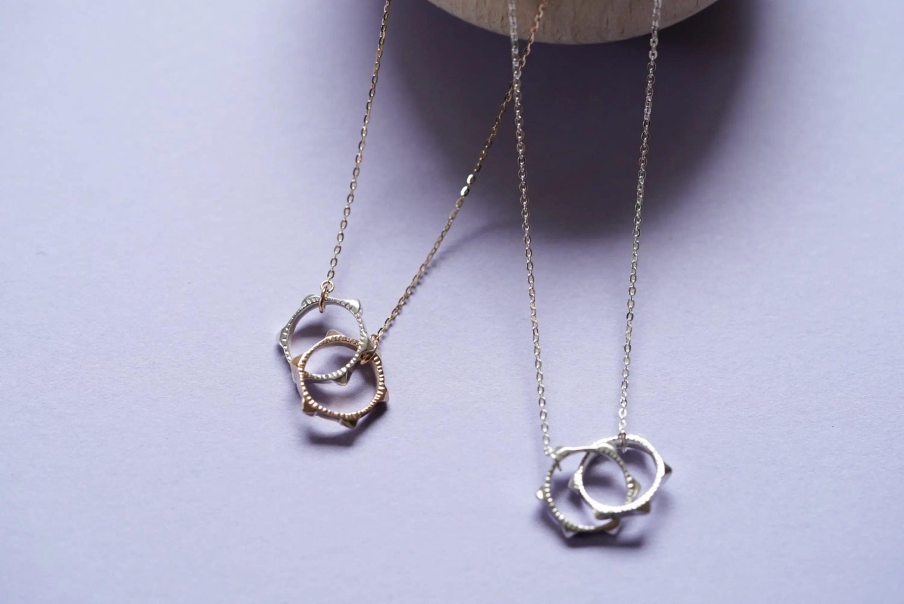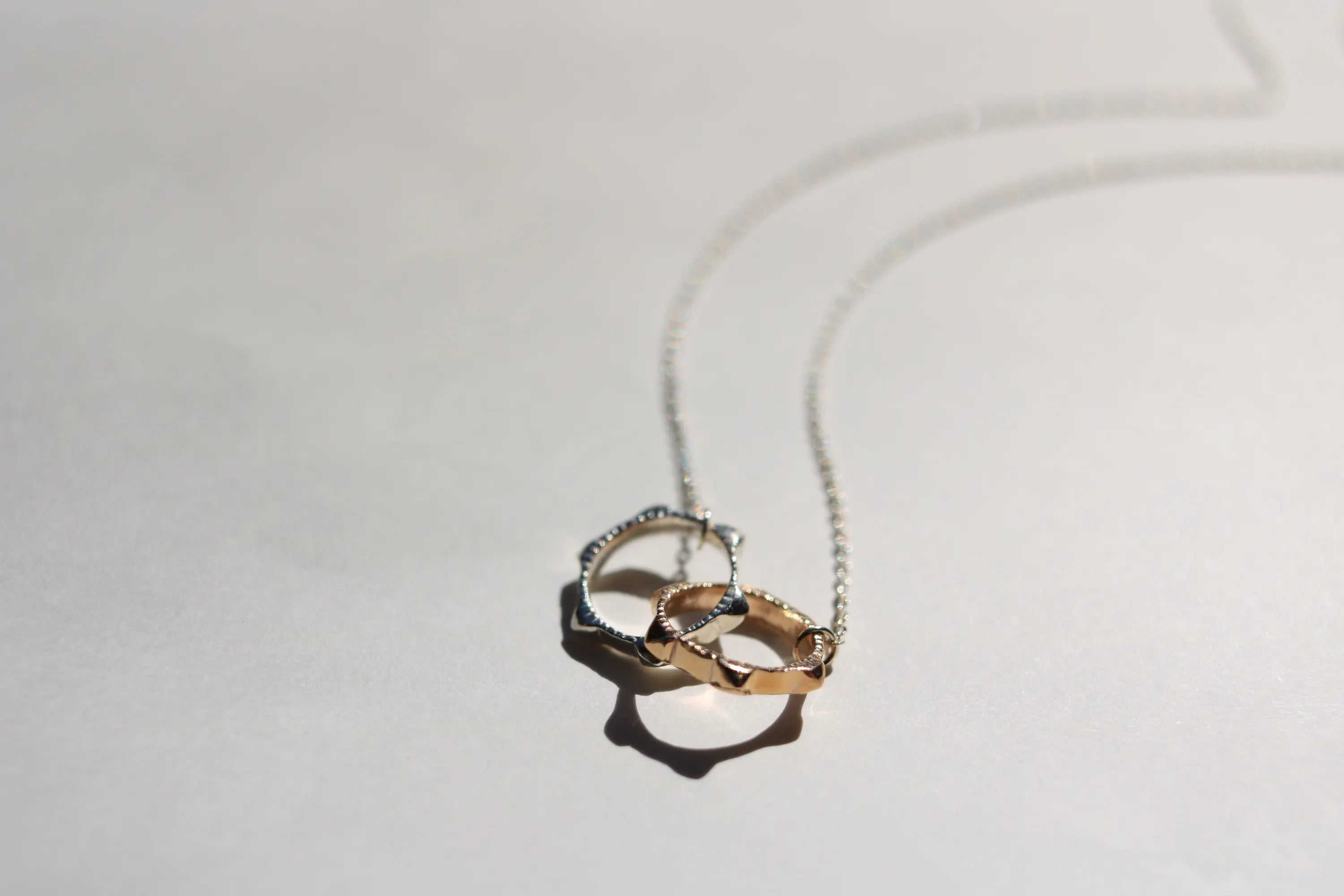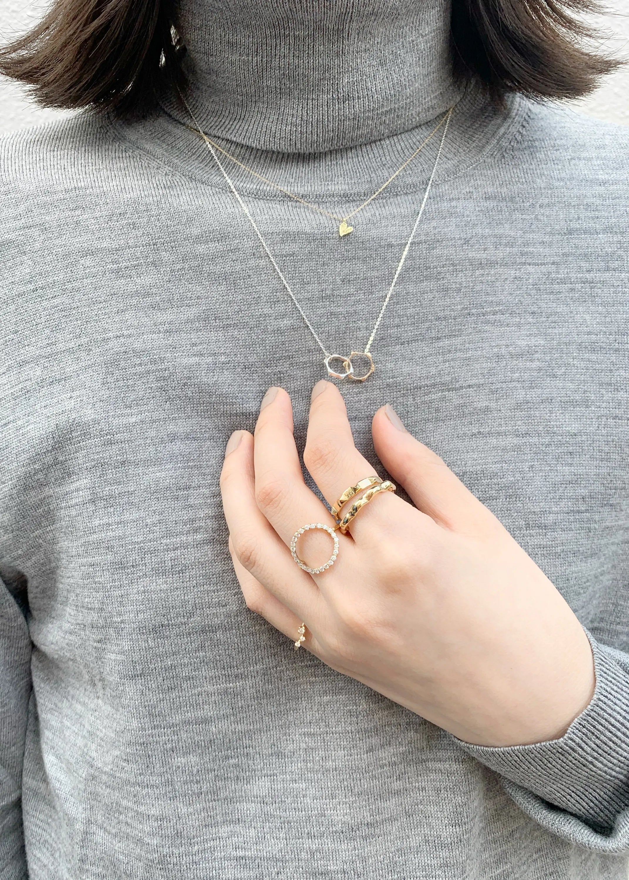 2つの輪には、「鏡面仕上げ」を施し、あえてサイドに「テクスチャー」を入れて全体に躍動感を生み出しました。胸元にシルバーとゴールドのミックスカラーを取り入れることで、洋服やジュエリー全体のスタイリングの自由度が増し、より楽しく、簡単にコーディネートを完成させることが可能に。特にKAORUオリジナルのピンクベージュゴールドは肌なじみの良い、やわらかな印象を与え、その中にシルバーのすっきりとしたマニッシュな輝きが全体を引き締めます。
