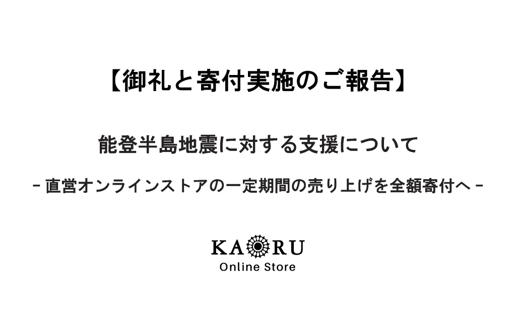 先般、KAORU Online Storeで実施いたしました、能登半島地震に対する支援「 直営オンラインストアの一定期間の売り上げを全額寄付へ」において、大変多くの皆さまに支援賜りましたことを心より御礼申し上げると共に、寄付に関するご報告をさせて頂きます。
