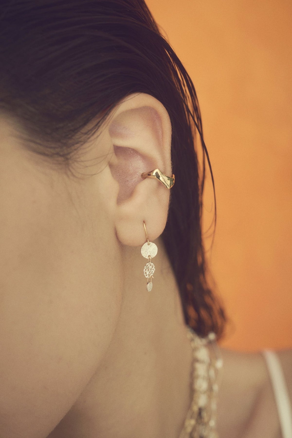 上からグラデーション状に大きさの異なるモチーフを配することで生まれた上品な揺れ感が魅力のピアス。