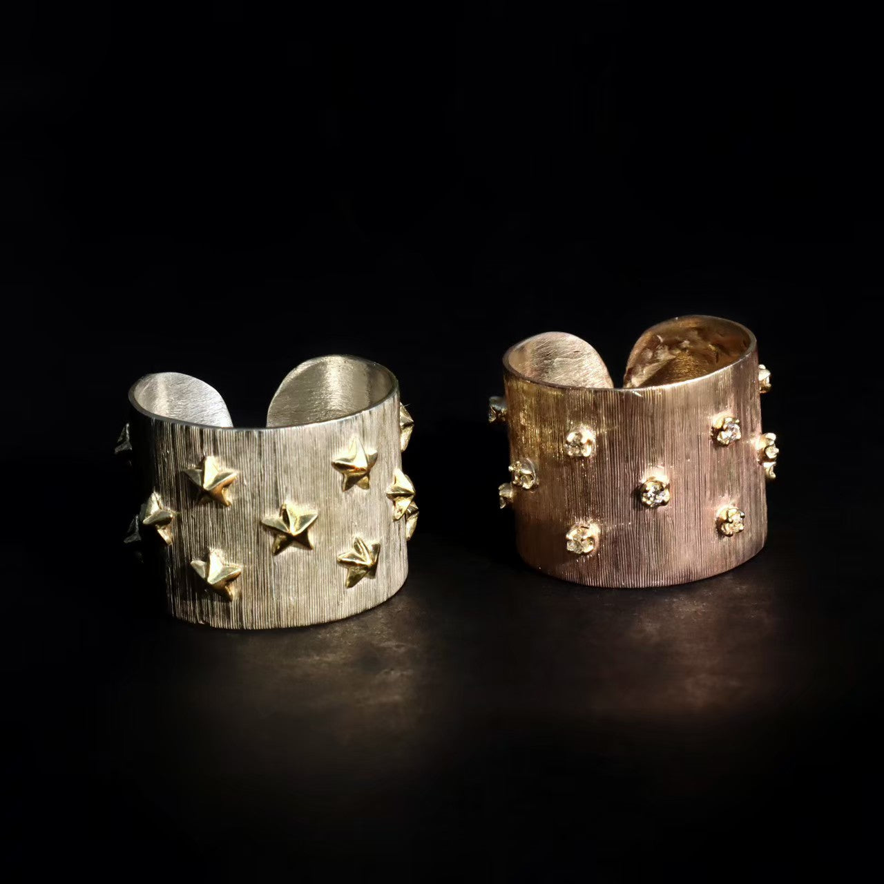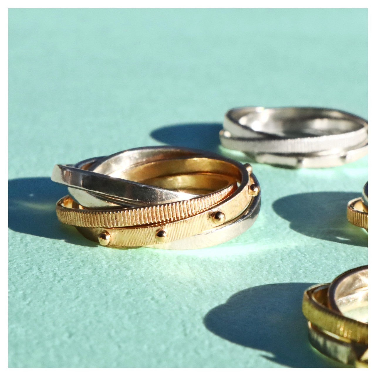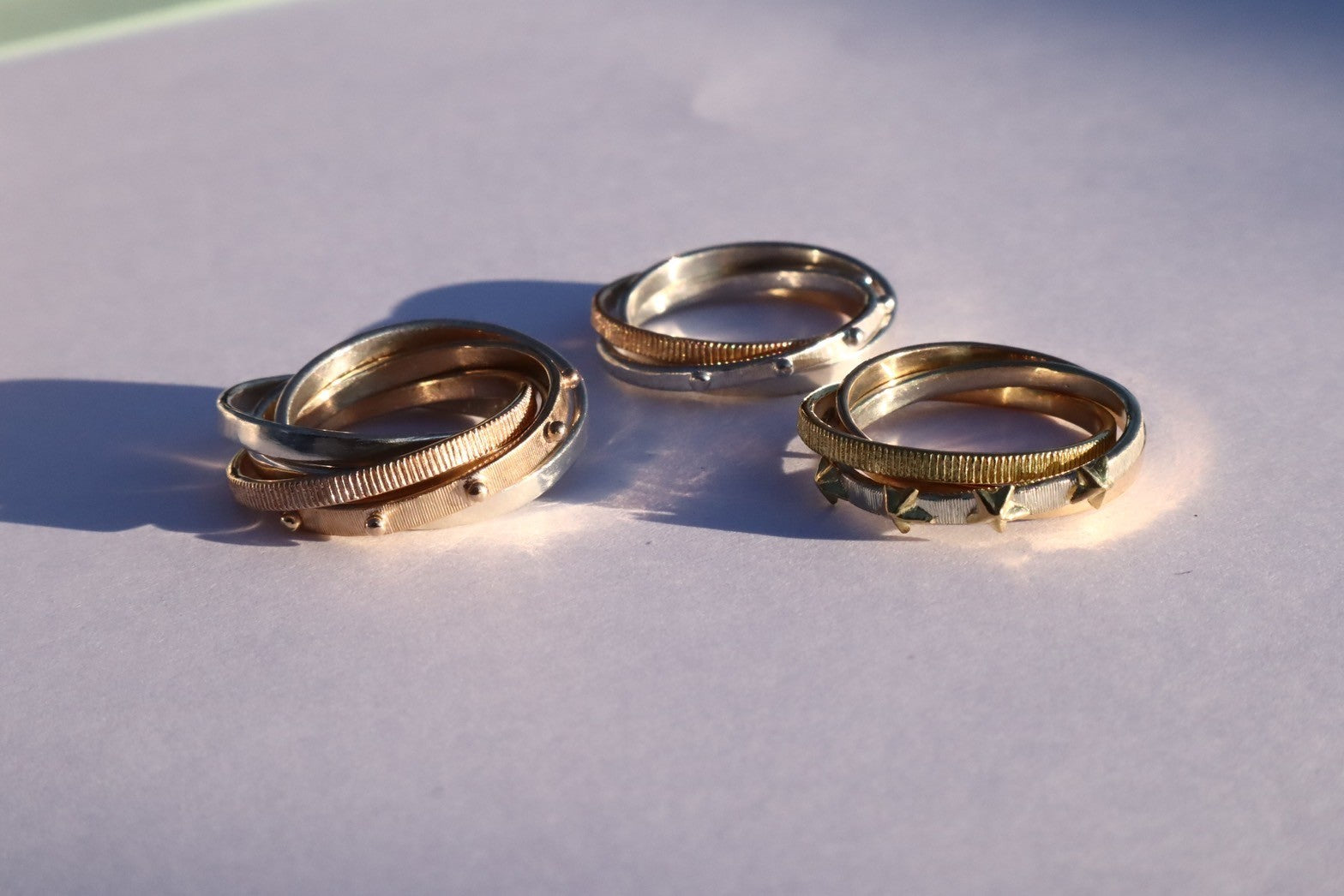 3連や5連リングなどは、光沢仕上げとテクスチャ仕上げになっているジャンルの違う輪が、うまく混ざりあって、そして繋がって一つにまとめ上げている。